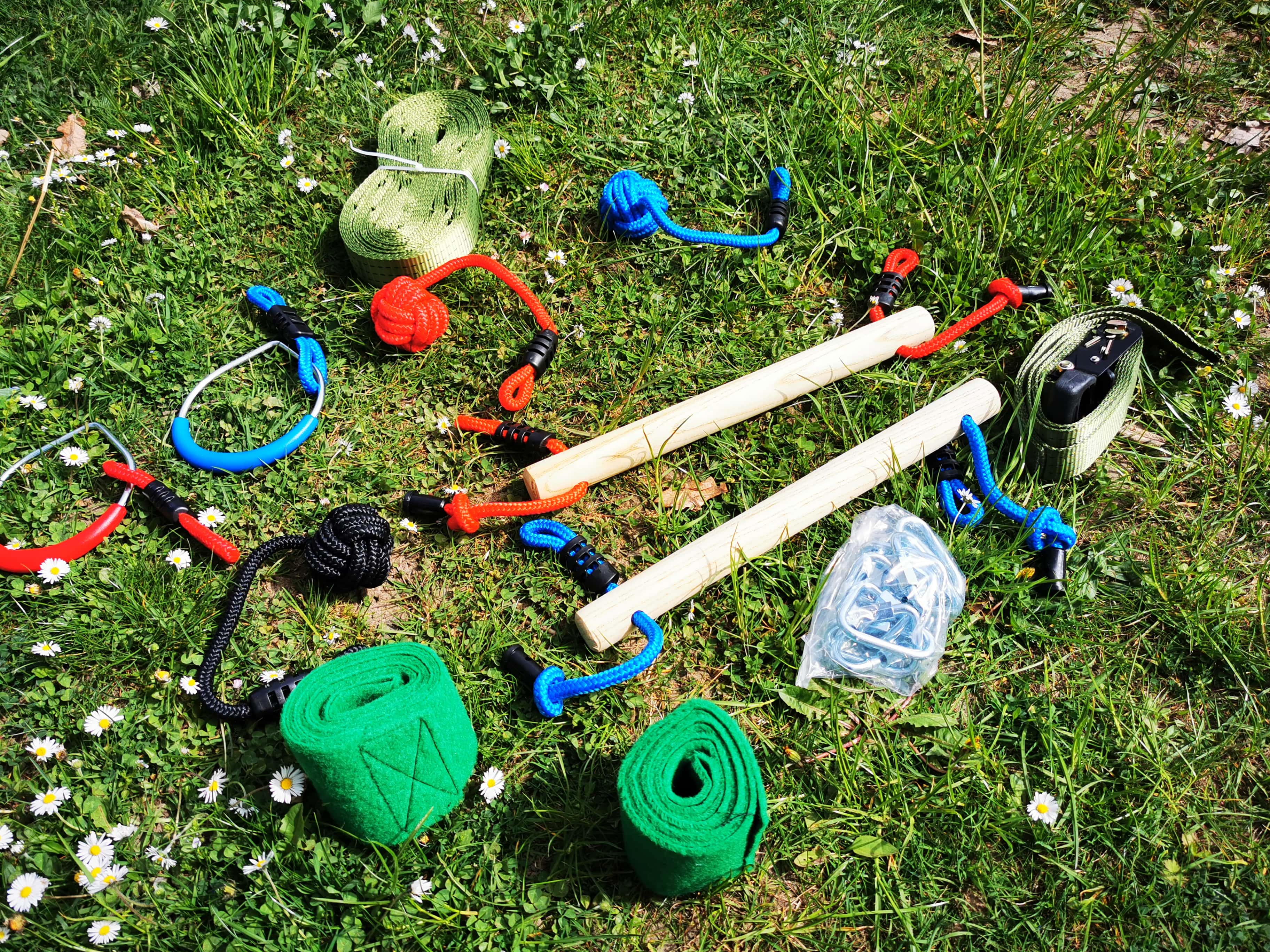 12 m langer Hangelpfad für Kinder ab 3 Jahre, mit Baumschonern Set besteht aus: 1 Slackline-Band, 2 Affenschaukeln, 2 Turnringe, 3 Seilknoten, 2 Baumschoner inkl. Montagematerial |